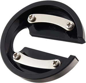 Two sharp, rounded blades are secured in place in a unique blade guard