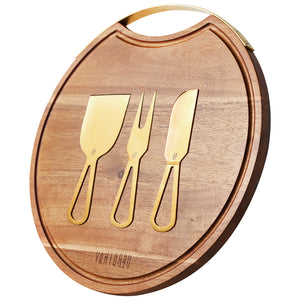 • The Vintorio Cheese Board and Knife Bundle includes two (2) items: one (1) Vintorio Wooden Cheese Board - Round 12" Serving Plate with Handle and one (1) Vintorio Cheese Knife Set (3-Piece, Stainless Steel, Gold Finish).